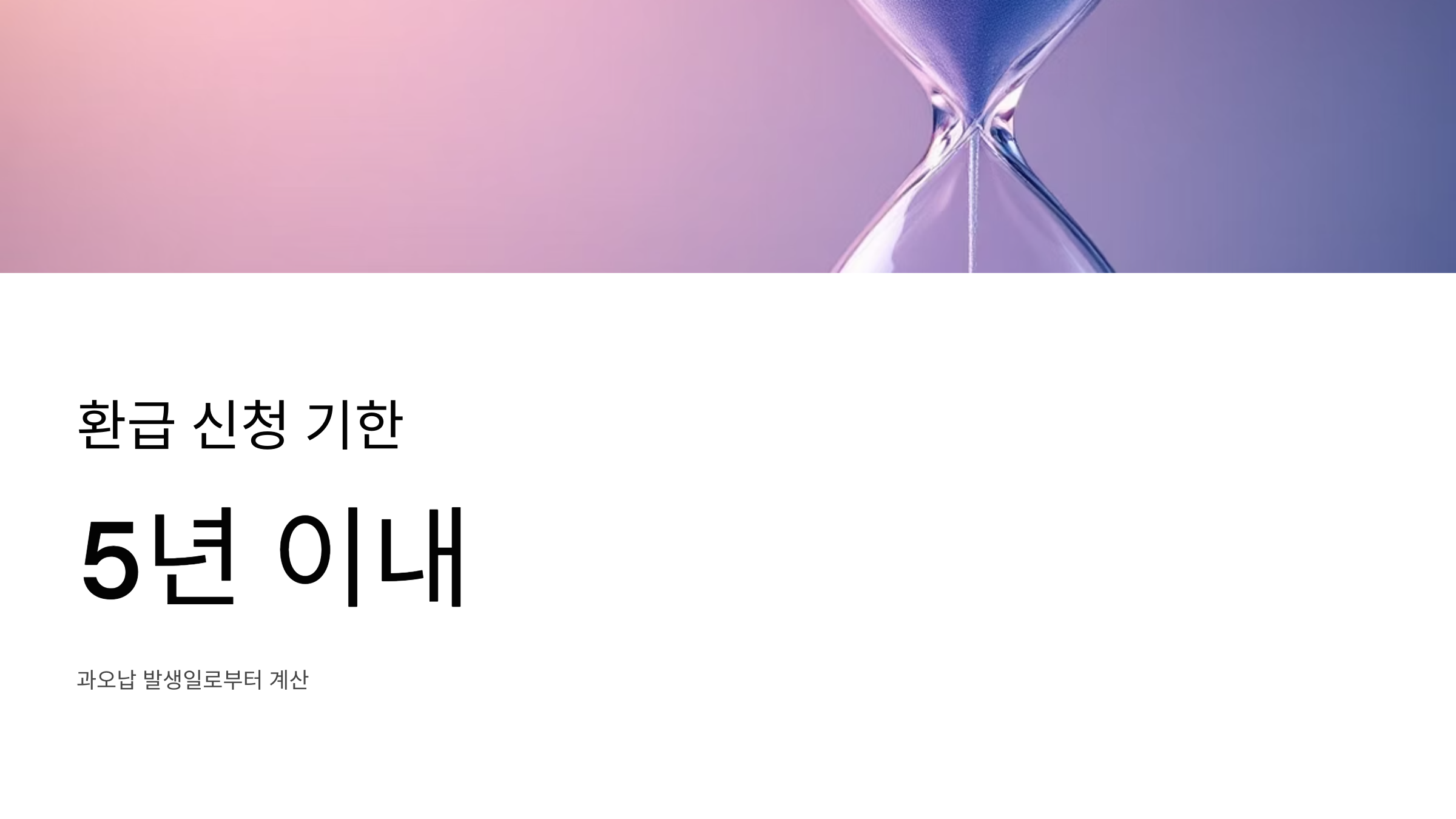 환급 신청은 과오납이 발생한 날로부터 5년 이내에 해야 합니다. 이를 넘기면 환급받을 수 없으므로, 가급적 빨리 신청하는 것이 좋습니다.